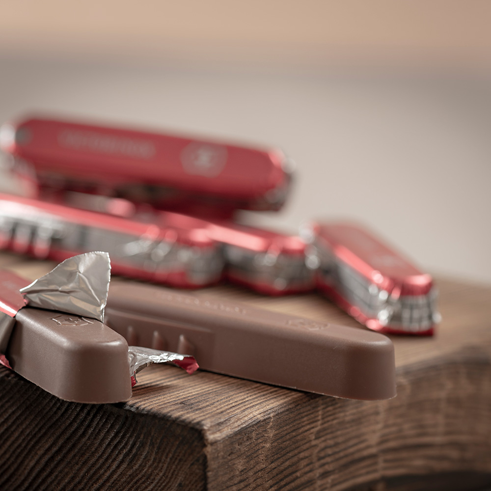 Victorinox Chocolate Knife aus feinster Schweizer Milchschokolade gefüllt mit einer Haselnussfüllung. 1 Stück à 28 g Victorinox Chocolate Knife